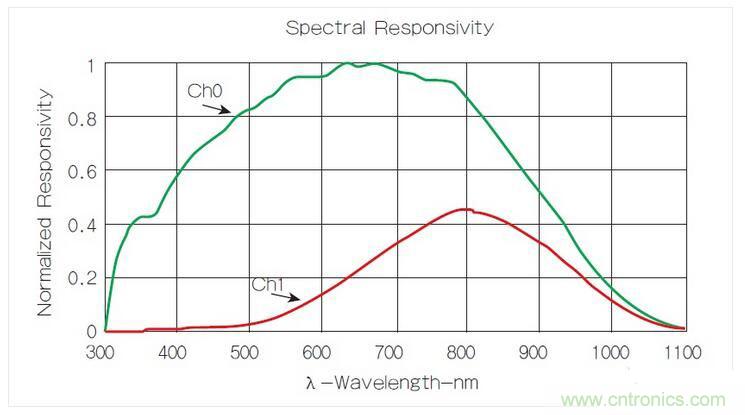 艾邁斯半導(dǎo)體已針對這個問題提出一個更好的解決方案:雙二極管(dual-diode)模塊。其中一個光電二極管(如圖2中所示的Channel 0)用來感測全光譜,另一個(圖中的Channel 1)則主要用來感測光譜中的紅外線部分。從全光譜傳感器的輸出中減掉紅外線光電二極管的輸出,則可得到可見光的測量結(jié)果。