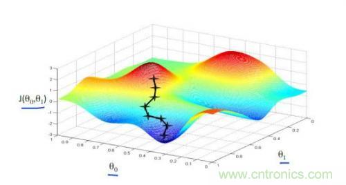 以上我們是以一維數(shù)據(jù)來看梯度下降,但我們的照片是多維數(shù)據(jù),此時(shí)如何求導(dǎo)數(shù)?又如何梯度下降呢?此時(shí)我們需要用到偏導(dǎo)數(shù)的概念。其實(shí)它與導(dǎo)數(shù)很相似,因?yàn)閤是多維向量,那么我們假定計(jì)算Xi的導(dǎo)數(shù)時(shí),x上的其他數(shù)值不變,這就是Xi的偏導(dǎo)數(shù)。此時(shí)應(yīng)用梯度下降法就如下圖所示,θ是二維的,我們分別求θ0和θ1的導(dǎo)數(shù),就可以同時(shí)從θ0和θ1兩個(gè)方向移動(dòng)相應(yīng)的步長(zhǎng),尋找最低點(diǎn),如下圖所示: