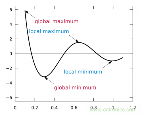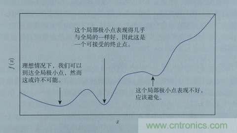 這樣,斜率為0時(shí)我們其實(shí)就得到了函數(shù)f在該點(diǎn)可以得到最小值。那么,把x向左或者向右移一點(diǎn),到底移多少呢?如果移多了,可能移過了,如果移得很少,則可能要移很久才能找到最小點(diǎn)。還有一個(gè)問題,如果f(x)操作函數(shù)有多個(gè)局部最小點(diǎn)、全局最小點(diǎn)時(shí),如果x移的非常小,則可能導(dǎo)致通過導(dǎo)數(shù)只能找到某個(gè)并不足夠小的局部最小點(diǎn)。如下圖所示: