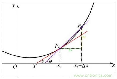 從幾何意義上看,變化率就變成了斜率,這更容易理解怎樣求函數(shù)的最小值。例如下圖中有函數(shù)y=f(x)用粗體黑線表示,其在P0點(diǎn)的變化率就是切線紅線的斜率: