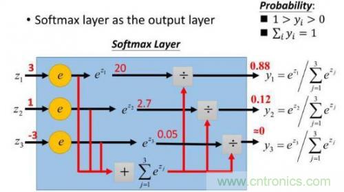 這樣給定x后可以得到x在各個(gè)類別下的概率。假定三個(gè)類別的得分值分別為3、1、-3,則按照上面的公式運(yùn)算后可得概率分別為[0.88、0.12、0],計(jì)算過程如下圖所示: