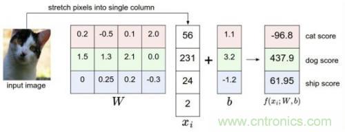比如我們有訓(xùn)練數(shù)據(jù)集照片對(duì)應(yīng)著cat、dog、ship三個(gè)類別,某個(gè)輸入照片經(jīng)過函數(shù)f(x)=x*W+b,前向運(yùn)算得到該照片屬于這3個(gè)分類的得分值。此時(shí),這個(gè)函數(shù)被稱為得分函數(shù),如下圖所示,假設(shè)左邊關(guān)于貓的input image是一個(gè)4維向量[56,231,24,2],而W權(quán)重是一個(gè)4*3的矩陣,那么相乘后再加上向量[1.1,3.2,-1.2]可得到在cat、 dog、ship三個(gè)類別上的得分: