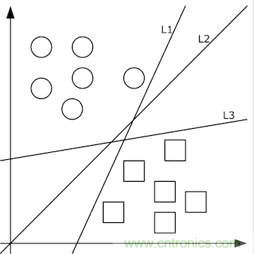 由清晰的人臉照轉(zhuǎn)化出的像素值矩陣,應(yīng)當(dāng)設(shè)計(jì)出什么樣的函數(shù)f(x)轉(zhuǎn)化為特征值呢?這個(gè)問題的答案依賴于分類問題。即,先不談特征值,首先如何把照片集合按人正確地分類?這里就要先談?wù)剻C(jī)器學(xué)習(xí)。機(jī)器學(xué)習(xí)認(rèn)為可以從有限的訓(xùn)練集樣本中把算法很好地泛化。所以,我們先找到有限的訓(xùn)練集,設(shè)計(jì)好初始函數(shù)f(x;w),并已經(jīng)量化好了訓(xùn)練集中x->y。如果數(shù)據(jù)x是低維的、簡(jiǎn)單的,例如只有二維,那么分類很簡(jiǎn)單,如下圖所示: