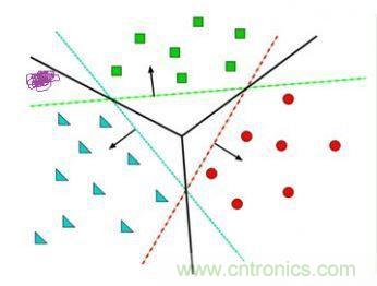 給定隨機(jī)數(shù)作為a,c,b的初始值,我們通過訓(xùn)練數(shù)據(jù)不斷的優(yōu)化參數(shù)a,b,c,把不合適的L1、L3等分類函數(shù)逐漸訓(xùn)練成L2,這樣的L2去面對(duì)泛化的測(cè)試數(shù)據(jù)就可能獲得更好的效果。然而如果有多個(gè)類別,就需要多條分類直線才能分出,如下圖所示: