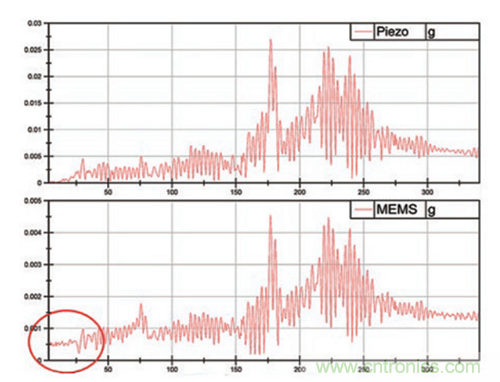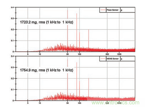 圖2顯示了21 kHz諧振頻率的MEMS加速度計和25 kHz諧振頻率的PZT傳感器的頻譜測量結(jié)果。MEMS加速度計在1 Hz至1 kHz頻段中的均方根(rms)輸出要比PZT加速度計高出大約30 mg或1.7%。