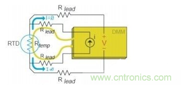 與熱敏電阻相似,鉑電阻溫度傳感器(RTD)也是用鉑制成的熱敏感電阻。當(dāng)通過(guò)測(cè)量電壓計(jì)算RTD 溫度時(shí),數(shù)字萬(wàn)用表用已知電流源測(cè)量該電流源所產(chǎn)生的電壓。這一電壓為兩條引線(Vlead)上的壓降加RTD上的電壓(Vtemp)。例如,常用RTD 的電阻為100Ω,每1℃僅產(chǎn)生0.385Ω的電阻變化。如果每條引線有10Ω電阻,就將造成26℃的測(cè)量誤差,這是不可接受的。所以應(yīng)對(duì)RTD作4線歐姆測(cè)量。