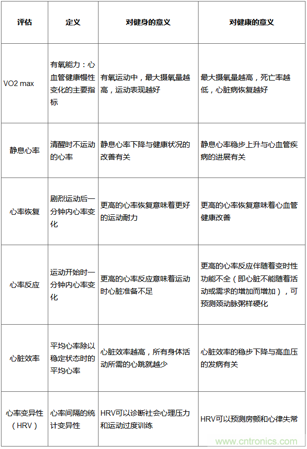 【導讀】在日益數字化的世界中,光學心率傳感器在可穿戴設備中的應用越來越廣泛。這些設備中數不清的應用可提供從個人活動、健身水平到健康狀況的所有內容。精準的生物識別傳感器數據可以提供準確的健身/健康評估,但設計師和工程師究竟能用這些評估做些什么呢?表1總結了目前在健身應用中使用的一些常見評估,這些評估也證明了健康醫(yī)療的意義。