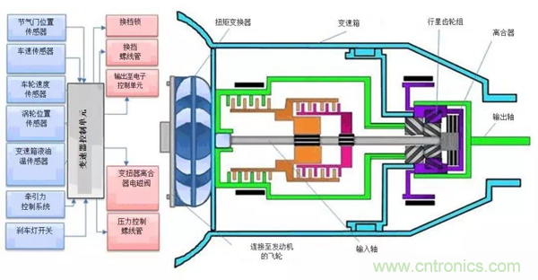 自動變速器汲取汽車發(fā)動機產(chǎn)生的功率,然后通過符合各種駕駛需求的不同的齒輪傳動比傳導(dǎo)這些功率。齒輪傳動比之所以不同,是為了確保發(fā)動機轉(zhuǎn)速(RPM)和供應(yīng)給車輪的扭矩與當前車速和加速度匹配。來自發(fā)動機飛輪的動力通過扭矩變換器傳輸給變速器(見圖1)。