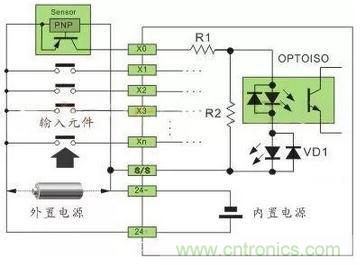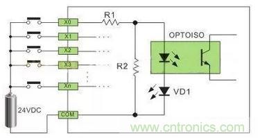 PLC 的數(shù)字量輸入接口并不復雜,PLC 為了提高抗干擾能力,輸入接口都采用光電耦合器來隔離輸入信號與內(nèi)部處理電路的傳輸。因此,輸入端的信號只是驅(qū)動光電耦合器的內(nèi)部 LED 導通,被光電耦合器的光電管接收,即可使外部輸入信號可靠傳輸。