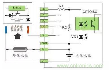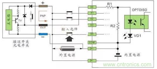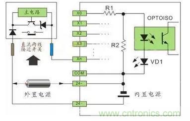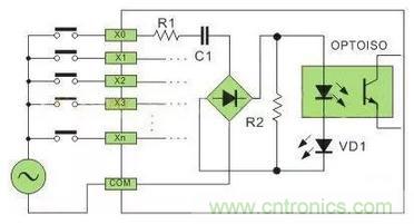直流電可以由PLC內(nèi)部提供也可以外接直流電源提供給外部輸入信號的元件。R2在電路中的作用是旁路光電耦合器內(nèi)部LED的電流,保證光電耦合器LED不被兩線制接近開關(guān)的靜態(tài)泄漏電流導通。