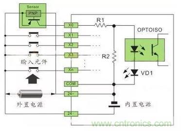 為了節(jié)省輸入端子,單端共點輸入的結(jié)構(gòu)是在 PLC 內(nèi)部將所有輸入電路(光電耦合器)的一端連接在一起接到標示為 COM 的內(nèi)部公共端子,各輸入電路的另一端才接到其對應(yīng)的輸入端子 X0、X1、X2、....