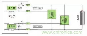SOURCE源型為電流從輸入端流進,那么輸入端與電源正極相連即可,說明接口內(nèi)部的光電耦合器為單端共點為電源負極,可接PNP型傳感器。