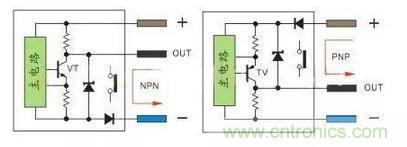 3、有源三線傳感器(電感接近開關(guān)、電容接近開關(guān)、霍爾接近開關(guān)、光電開關(guān)等)直流有源三制線接近開關(guān)與光電開關(guān)輸出管使用三極管輸出,因此傳感器分NPN和PNP輸出,有的產(chǎn)品是四線制,有雙NPN或雙PNP,只是狀態(tài)剛好相反,也有NPN和PNP結(jié)合的四線輸出。