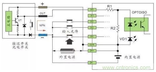 SINK漏型為電流從輸入端流出,那么輸入端與電源負極相連即可,說明接口內(nèi)部的光電耦合器為單端共點為電源正極,可接NPN型傳感器。