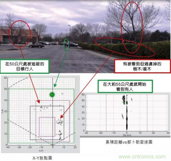 圖1顯示了在一項安防應(yīng)用中,使用芯片上智能算法在50公尺室外入侵探測器的一項實驗結(jié)果。入侵探測器用于確定是否有人進(jìn)入受保護(hù)區(qū)域,例如貨運場、停車場或后院。一些仰賴光學(xué)或紅外線感測的探測器,可能會檢測到附近樹木和灌木的錯誤運動。而毫米波傳感器使用處理和算法來濾除和防止錯誤的檢測,僅在人體運動時觸發(fā)探測器。安防攝影機(jī)和可視門鈴(video doorbells)可以通過聯(lián)網(wǎng)服務(wù)器處理圖像信息,執(zhí)行相同的錯誤檢測過濾;但這些基于服務(wù)器的系統(tǒng)所提供的功能通常需要使用者付費,毫米波技術(shù)則可實現(xiàn)在傳感器本身進(jìn)行決策,無需聯(lián)網(wǎng)服務(wù)器。