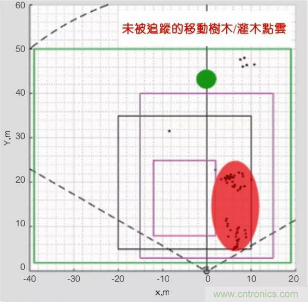 圖2:來自室外入侵應(yīng)用的動畫點云,黑點表示移動的物件,包括人、樹木、灌木;該算法將人顯示為綠色,同時過濾掉其它移動物件
