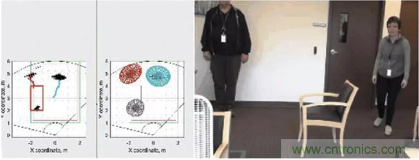 圖4:使用毫米波傳感器執(zhí)行分類的范例:中間圖上所有移動目標(biāo)都分配了一個軌道,其中的每個彩色區(qū)域代表一個人