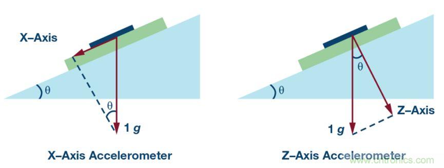 如下圖,坡度角θ。下圖左邊,檢測(cè)軸X軸垂直于重力平面(坡度為0時(shí)),此時(shí)加速度傳感器的輸出Ax=sin(θ)*1g。下圖右邊,檢測(cè)軸Z軸平行于重力平面(坡度為0時(shí)),此時(shí)加速度傳感器的輸出Az=cos(θ)*1g。
