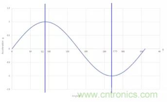圖1:單軸加速度傳感器360°旋轉(zhuǎn)對應(yīng)輸出