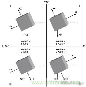 圖2:不同象限與加速度輸出值正負(fù)的關(guān)系