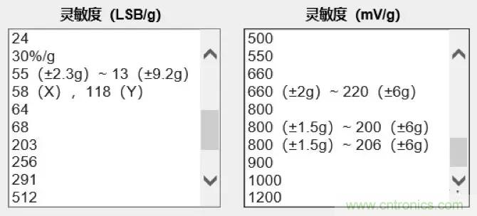 靈敏度(LSB/g)主要針對數(shù)字輸出加速度傳感器,代表一個(gè)重力加速度(g)下,輸出能區(qū)分多少位LSB。上面已經(jīng)根據(jù)應(yīng)用要求推導(dǎo)出,假設(shè)應(yīng)用要求最小分辨率為1°,靈敏度需要大于58LSB/g。那么可以根據(jù)這一結(jié)果直接在參數(shù)欄里選擇。