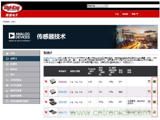 舉個(gè)例子, ADI三軸加速度傳感器ADXL355BEZ配套的評(píng)估板可以在Digi-Key的產(chǎn)品頁面中配用欄中找到匹配的評(píng)估板EVAL-ADXL355Z。也可以通過ADI加速度傳感器選擇與開發(fā)板選擇頁面中最后一欄中找到對(duì)應(yīng)的開發(fā)板。