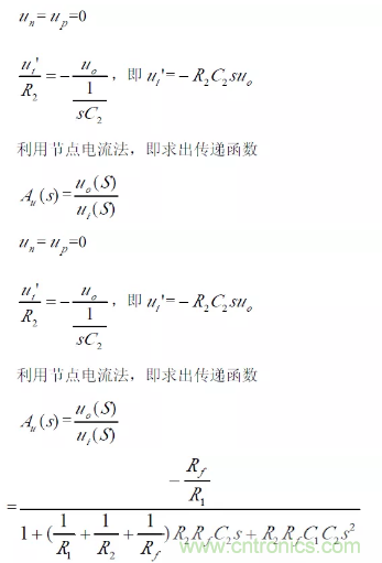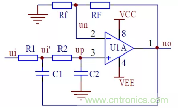 對于二階壓控低通濾波器來說,當通帶放大倍數(shù)Aup =1(單位增益)時,圖所示電路變?yōu)閳D所示,其中RF=R1+R2。