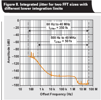 為了進(jìn)一步描述該點(diǎn),我們利用兩個(gè)不同的FFT尺寸—131,072 和 1,048,576 點(diǎn),使用 ADS54RF63 進(jìn)行實(shí)驗(yàn)。采樣速率設(shè)定為 122.88MSPS,而圖 8 則顯示了時(shí)鐘相位噪聲。我們將一個(gè) 6-MHz、寬帶通濾波器添加到時(shí)鐘輸入,以限制影響抖動(dòng)的寬帶噪聲數(shù)量。選擇 1-GHz 輸入信號的目的是確保 SNR 減弱僅由于時(shí)鐘抖動(dòng)。圖 8 表明兩個(gè) FFT 尺寸的 1/2 容器尺寸到 40MHz 相位噪聲整合抖動(dòng)結(jié)果都極為不同,而“表 1”的 SNR 測量情況也反映這種現(xiàn)象。