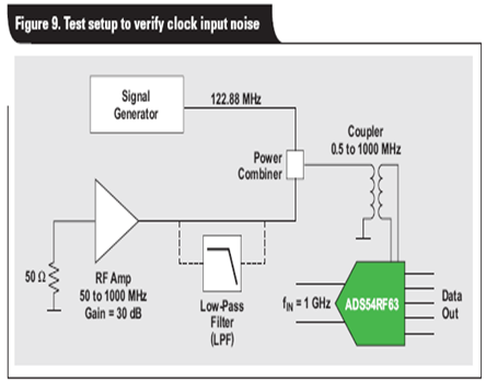 若想要驗(yàn)證時(shí)鐘相位噪聲是否需要整合至?xí)r鐘輸入帶寬,則需建立另一個(gè)實(shí)驗(yàn)。ADS54RF63 再次工作在 122.88 MSPS,其輸入信號為 1GHz,以確保 SNR 抖動(dòng)得到控制。我們利用一個(gè) RF 放大器,生成 50MHz 到 1GHz 的寬帶白噪聲,并將其添加至采樣時(shí)鐘,如圖 9 所示。之后,我們使用幾個(gè)不同低通濾波器 (LPF) 來限制添加至?xí)r鐘信號的噪聲量。