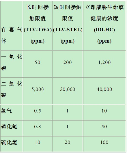 在美國,國家職業(yè)安全與健康研究所(NIOSH)和美國政府工業(yè)衛(wèi)生學(xué)家會議(ACGIH)已規(guī)定了許多有毒工業(yè)氣體的短時(shí)間和長時(shí)間接觸限值。"閾限值-時(shí)間加權(quán)平均值"(TLV-TWA)是指大多數(shù)工人可以在正常8小時(shí)工作日內(nèi)反復(fù)接觸而不會受到有害影響的時(shí)間加權(quán)平均濃度。"閾限值-短時(shí)間接觸限值"(TLV-STEL)是指大多數(shù)工人可以短時(shí)間接觸而不會受到刺激或傷害的濃度。"立即威脅生命或健康的濃度"(IDLHC)是一種限制性濃度,它會對生命立即或緩慢產(chǎn)生威脅,導(dǎo)致不可逆轉(zhuǎn)的健康損害,或者影響工人獨(dú)立逃生的能力。表1列出了幾種常見氣體的限值。